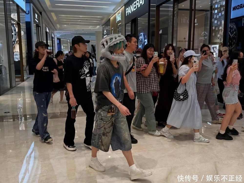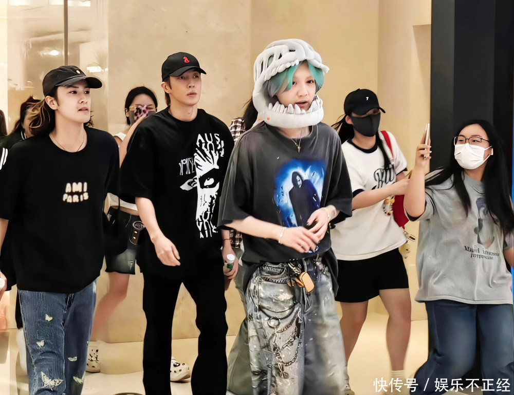 近日,一段鹿晗在商场穿着黑色T恤、宽松牛仔裤,戴着一个白色恐龙骨头套的画面在网上广泛传播。这种造型不仅与他一贯的帅气形象形成鲜明对比,更显得十分俏皮与可爱。尤其是他依旧带着绿色头发的造型,让人无法忽视。
